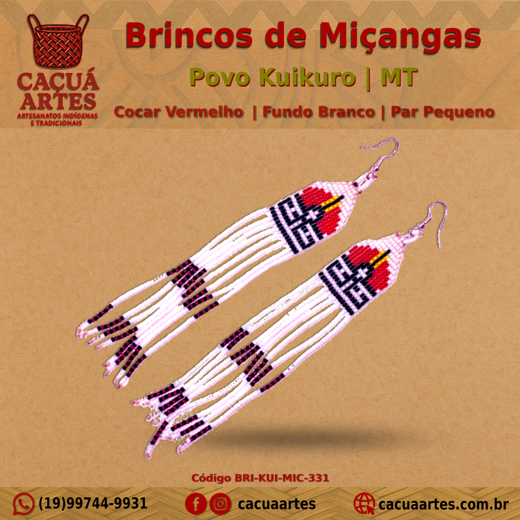 Par de brincos artesanalmente confeccionado pelo povo Kuikuro, habitante do Alto Xingu, em Mato Grosso. Produzidos com miçangas coloridas, formam grafismos e padrões geométricos que expressam a identidade visual Kuikuro, marcada pela simbologia de suas pinturas corporais, pela conexão com o território e pela espiritualidade comunitária.